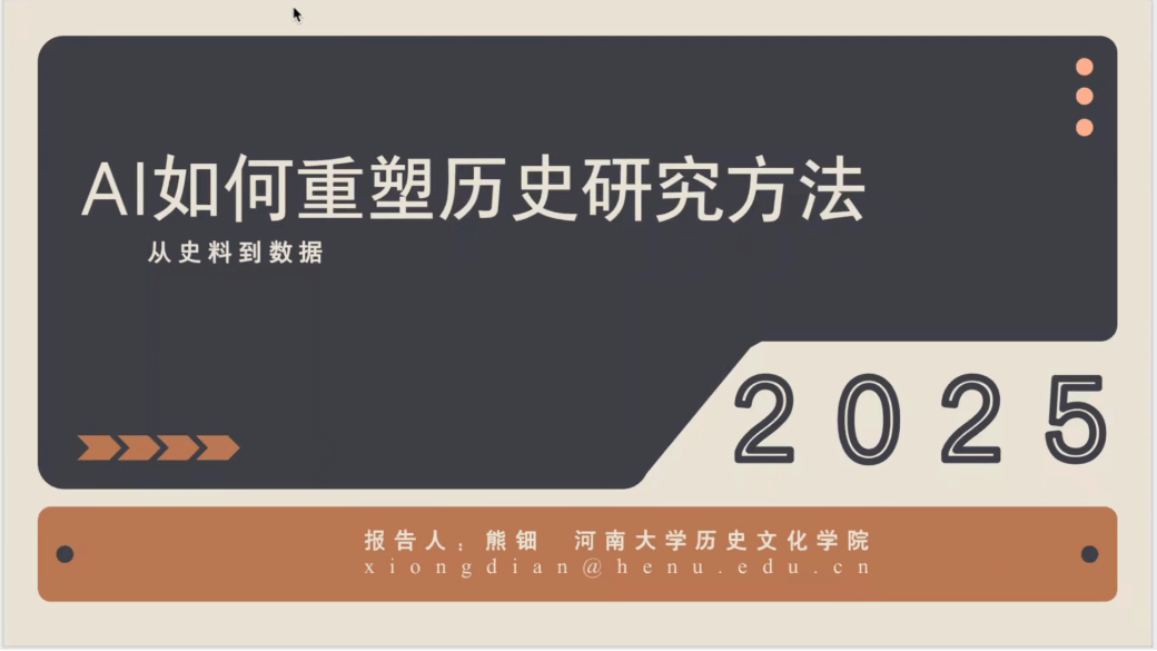 2025年3月15日上午,河南大学历史文化学院熊钿副教授在河南大学历史文化学院做题为《从史料到数据:AI如何重塑历史研究方法》的线上讲座。本场讲座由河南大学历史文化学院朱旭亮副教授主持。