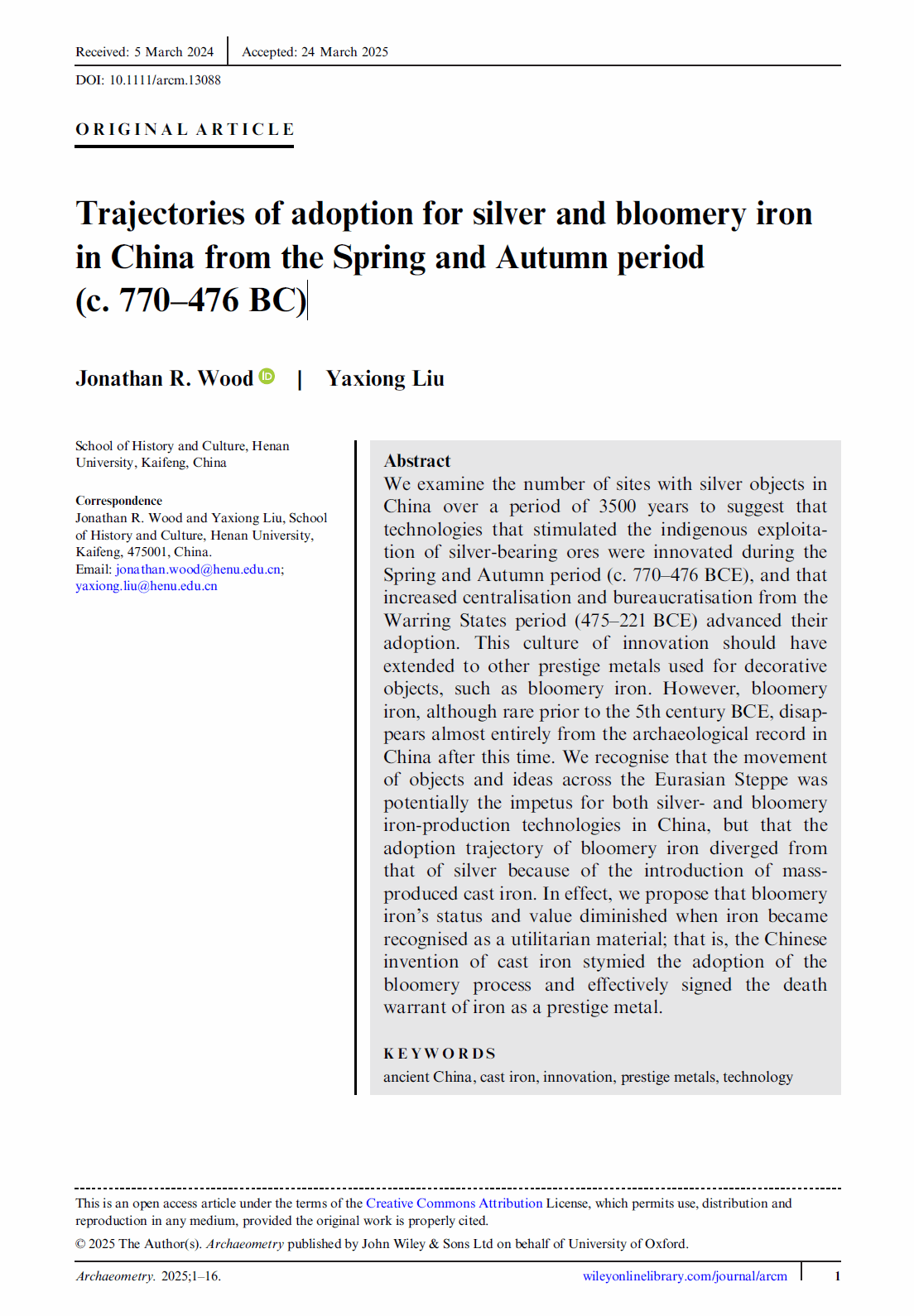 考古专业外籍教师Jonathan R. Wood与黄河学者刘亚雄合作研究成果“Trajectories of adoption for silver and bloomery iron in China from the Spring and Autumn period (c. 770–476 BC)”在国际期刊《Archaeometry》上发表。