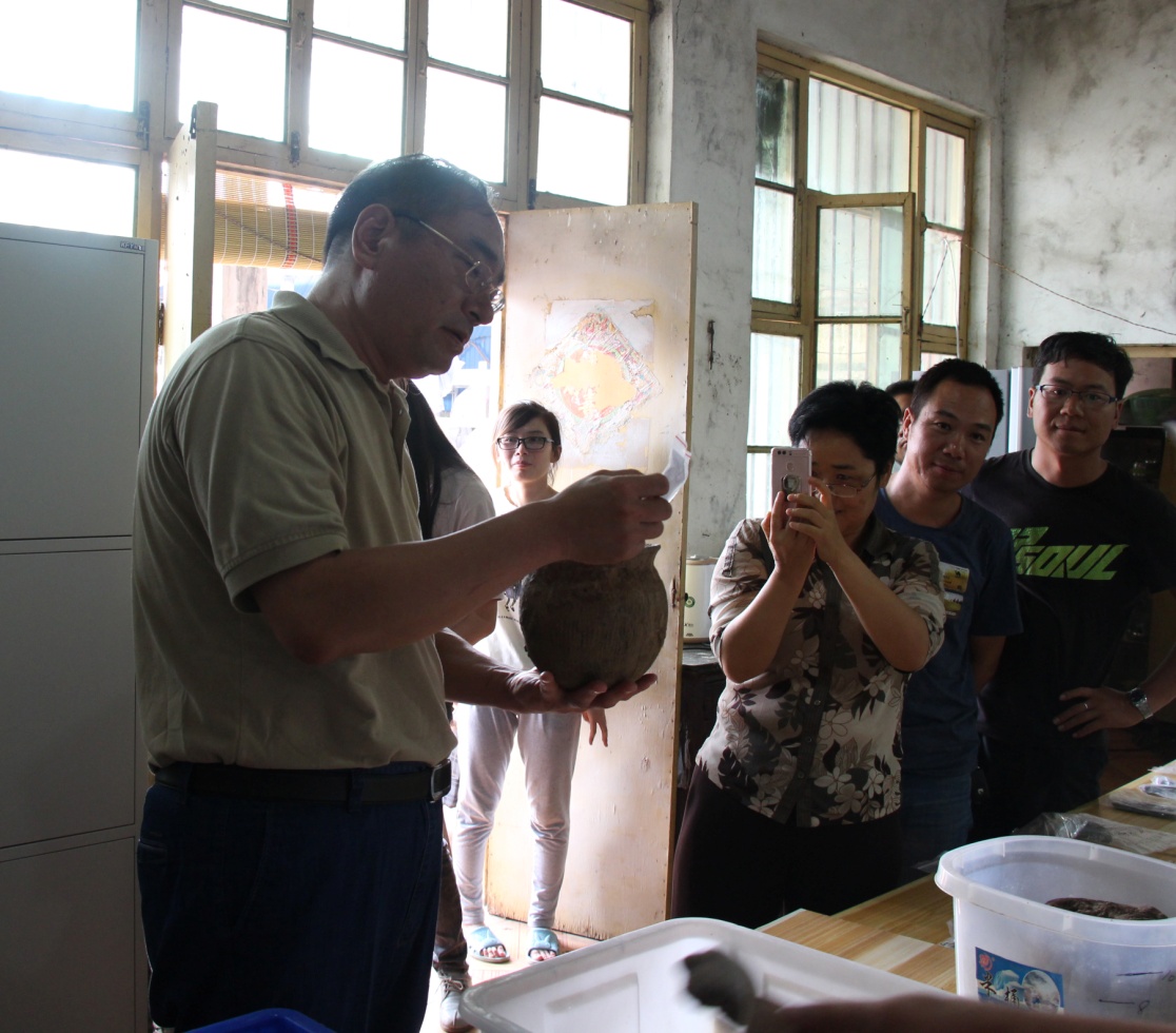 在驻地的小院落,孙校长深入了解同学们的工作、学习和生活情况。院落内,发掘物资摆放有序、文物架柜干净整洁,虽临近中午,参与实习的2014级博物馆学专业同学们依然汗流浃背的工作。在整理室内,孙校长仔细观摩发掘出土的大量陶器、石器、骨器、玉器等珍贵文物。他赞赏同学们,能够亲手挖出来这么多精美文物是特别幸福的事。