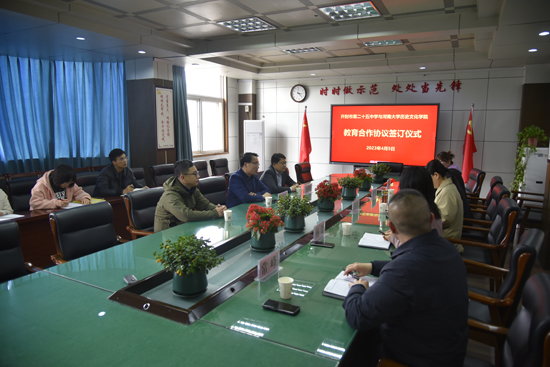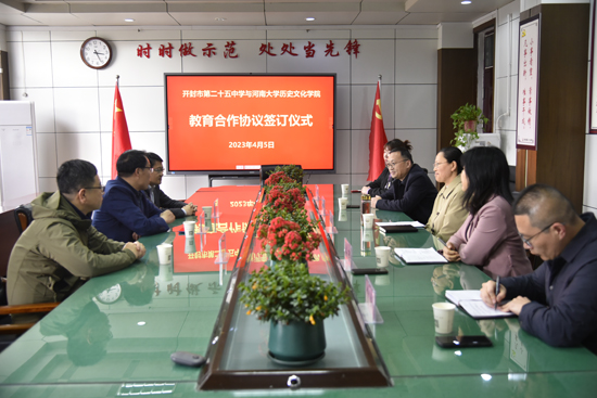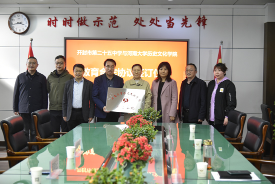 为了推进河南大学历史文化学院历史学科师范认证工作,2023年4月5日,河南大学历史文化学院与开封市第二十五中学签订教育合作协议。河南大学历史文化学院院长祁琛云、副院长闵祥鹏、中国古代史教研室主任武波和开封二十五中校长张海英、副校长杨瑞、教师发展处主任常峰、历史组组长赵玉英出席了签约仪式,河南大学历史文化学院教师代表和历史组教师代表参加。签约仪式由河南省普通高中一级学科基地负责人、河南大学历史文化学院研究生实践导师、名师工作室主任刘坚主持。